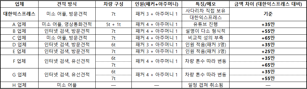 견적을 받으면서 느낀 건, 기본적인 설명이나 태도는 다들 큰 차이가 없다는 점이었습니다. 짐을 꼼꼼하게 살펴보는 것은 공통적이었고, 친절도 역시 대체로 무난했습니다.