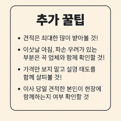 중간쯤에 적당해 보이는 금액이 나왔다고 덜컥 계약하지 마세요. 끝까지 받아보면 의외의 기회가 생깁니다. - 이삿날 아침, 파손 우려가 있는 부분은 꼭 업체와 함께 확인할 것!